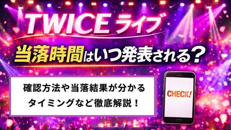TWICEのライブは毎回大きな人気を集めており、チケットの当落発表の日は多くのファンが結果を待つ瞬間でもあります。 そのため「TWICEのライブの当落時間はいつなの?」「何時に結果が分かるの?」と気になって検索する方も多いのではないでしょうか。 ラ... -